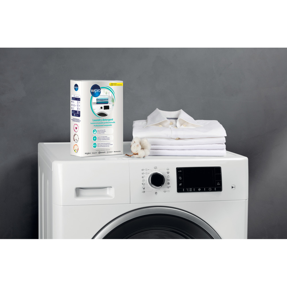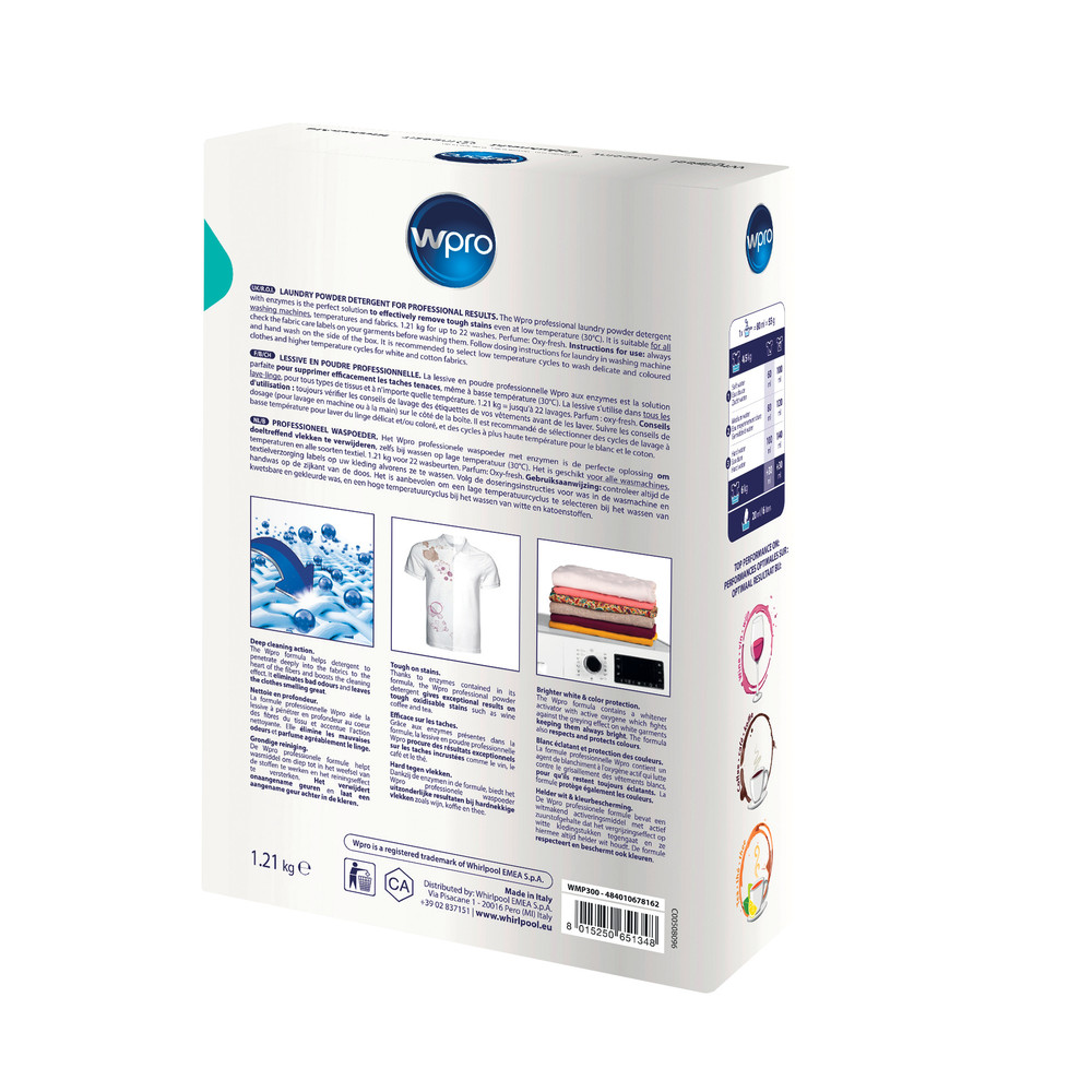 Wpron ammattimaisen pyykinpesujauheen entsyymit poistavat tehokkaasti sitkeää likaa, kuten viini-, kahvi- ja teetahrat, jopa alhaisissa lämpötiloissa (30 °C). Sen koostumus tunkeutuu syvälle kankaan kuituihin ja lisää puhdistustehokkuutta. Se sisältää myös aktiivista happea sisältävän valkaisutehostajan, joka ehkäisee valkoisten vaatteiden harmaantumista ja suojaa samalla värejä. Se sopii kaikille pesukoneille, lämpötiloille ja materiaaleille. 1,21 kilogrammalla jopa 22 pesukertaa.